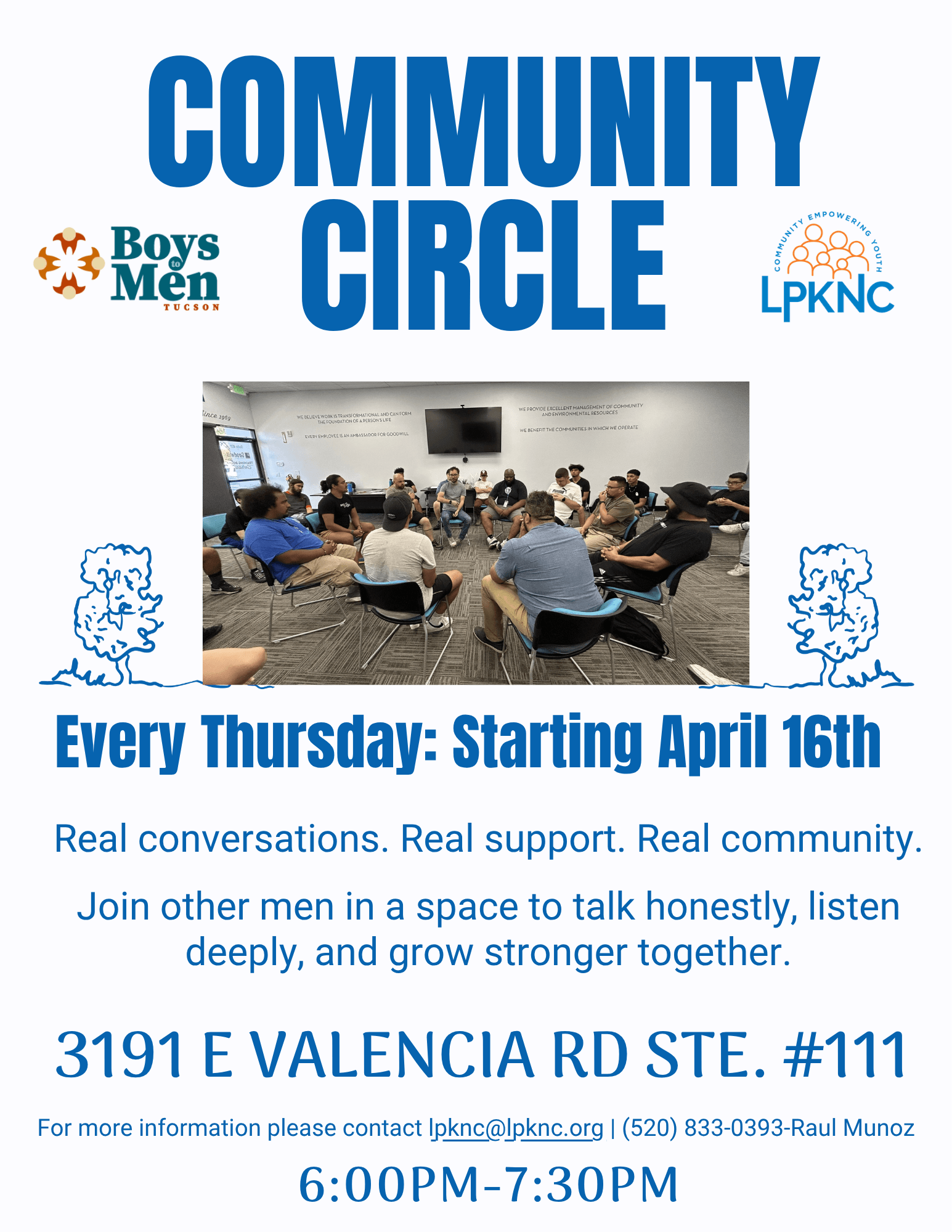 Community Circle is a weekly space for men 18+ to come together, connect, and engage in real conversations in a supportive, judgment-free environment. Through restorative circle practices, participants are invited to speak honestly, listen deeply, and build stronger relationships with themselves and others. This circle is offered in partnership with LPKNC, bringing community-rooted leadership and shared commitment to creating spaces where men can grow, reflect, and show up fully. No registration required, just come through and be part of the circle.